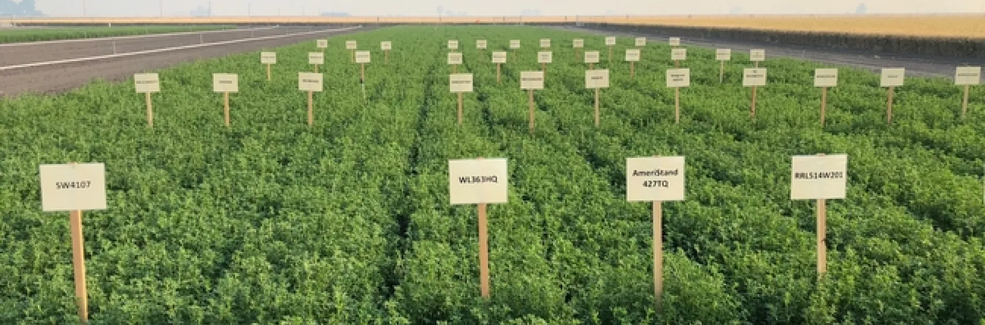 Alfalfa research such as this variety trial in Tulelake in 2018 benefits farmers and industry members. The first research projects funded by growers are a series of weed management trials for 2018-19.