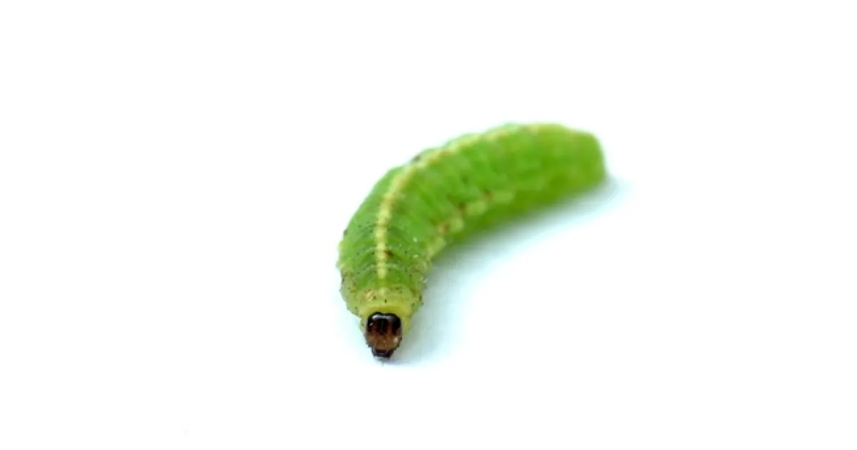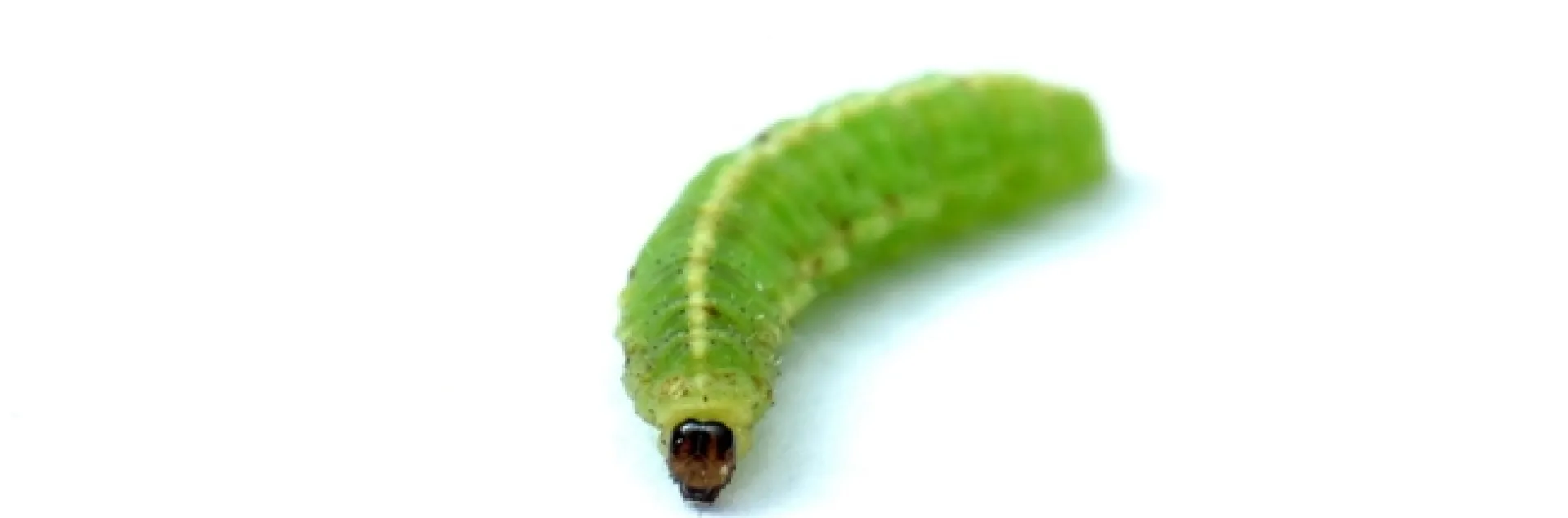 Figure 1. Alfalfa weevil larva, a key pest in California's alfalfa fields in the spring months (January-May), reducing yields and quality from feeding on the foliage. Chlorpyrifos has been widely used to control this pest, but in 2020, growers will need to look for alternatives. (Photo: Ian Grettenburger)