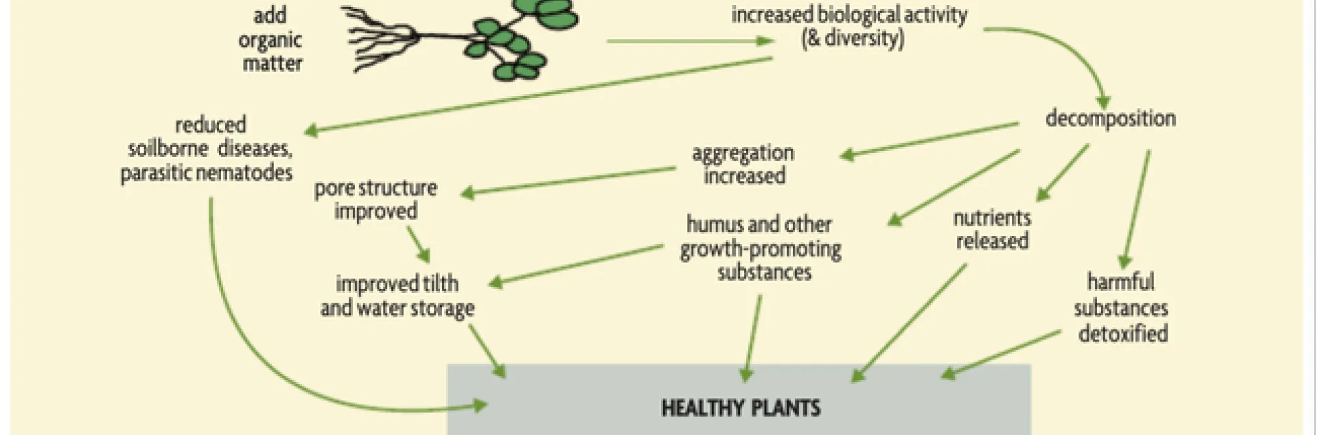 Figure 1. Model for healthy soils leading to healthy plants. Signs of healthy soils include better water infiltration, higher organic matter, and improved microbial activity.