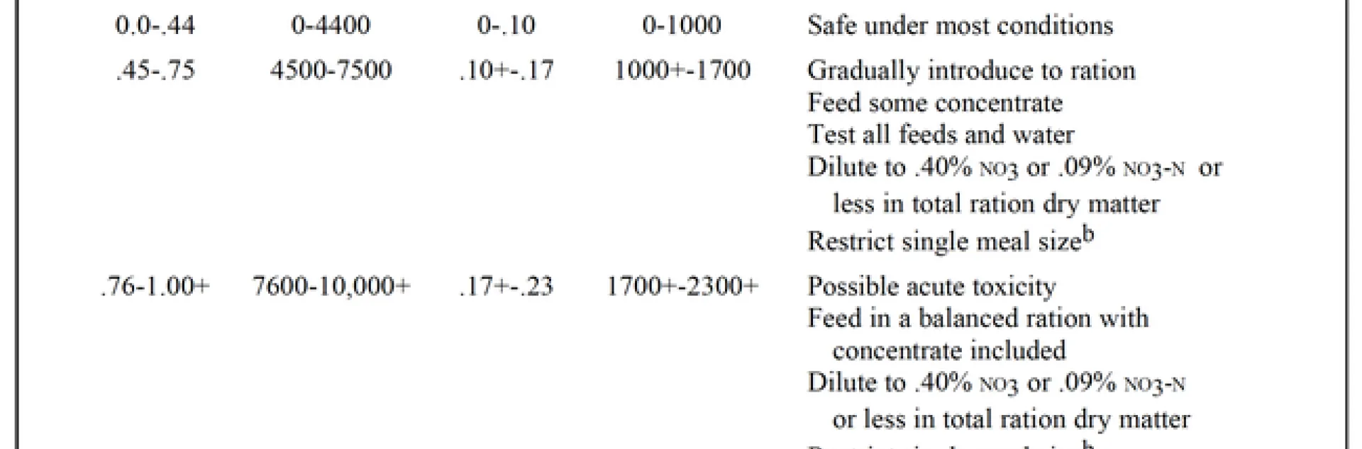 Adams RS, TR McCarty, and LJ Hutchinson. Prevention and control of nitrate toxicity in cattle. https://dairy-cattle.extension.org/prevention-and-control-of-nitrate-toxicity-in-cattle/