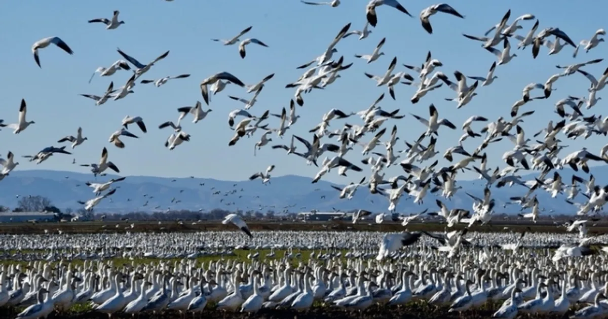 The Central Valley sits dead in the middle of the Pacific Flyway with millions of ducks and geese migrating from northern regions to the valley every year. A bird-watchers paradise, the Sacramento Valley supports one of the highest concentrations of waterfowl in the world with about 50% of all overwintering waterfowl in California found here, including 85% of all geese. As many as seven million ducks and geese or 10-15% of all North America's waterfowl call the Central Valley home during the winter months. This includes a third of all Pintails and almost the entire continental population of tule White-fronted geese and Aleutian Canada geese. Most geese overwinter in harvested rice fields, some in corn, particularly in the Delta, and the rest in wetlands. The rice, alfalfa, grains, and pasture cropping systems support this habitat.