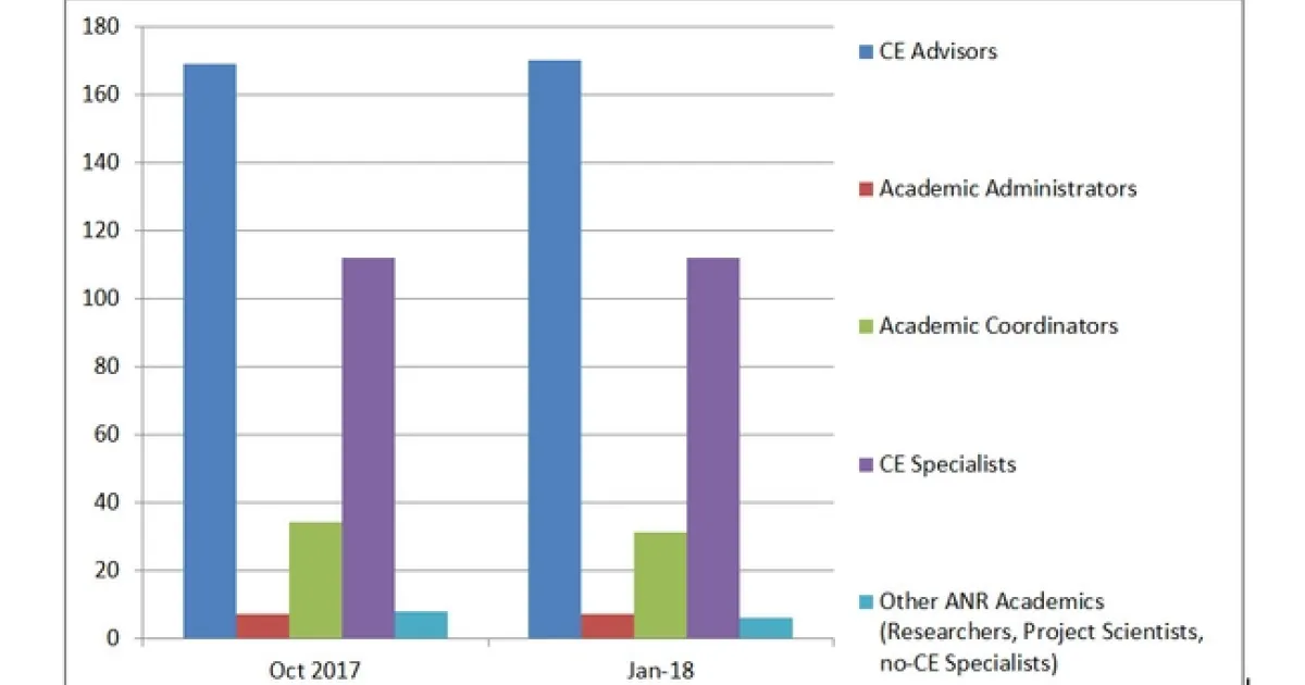 A fact that's even more fun – we are increasing in numbers! Progress to increase the academic footprint is slow. The Program, Planning and Evaluation group are tracking numbers of academics each quarter so that we can all start to see that progress. From the chart one can see that the Advisor headcount increased by 1 while the CE Specialist headcount remained steady. Other categories, plus AES headcount (not shown) dipped slightly. There will be dips because of the waves of retirements (June and December) offset by trickling of hires throughout the year, but as we continue to plot our course, a trend in growth will become more apparent.