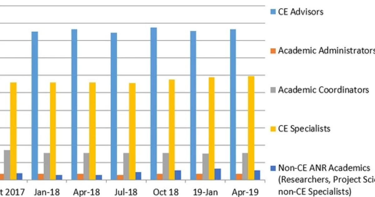 The April 2019 academic footprint numbers are in. Now granted there were a number of colleagues who departed just this past week, but, overall, the numbers are promising. CE Specialist numbers are at the highest (n = 119) since I first started tracking the numbers. CE Advisor numbers are tied with a year ago (n = 173) and just 2 persons less than the October 2018 high of 175 CE Advisors. Academic Coordinator numbers are where they have been most of the quarters (n = 31) and Academic Administrators remain steady (n = 7). The non-CE ANR Academic numbers tend to be most variable but are higher than 2018 numbers.