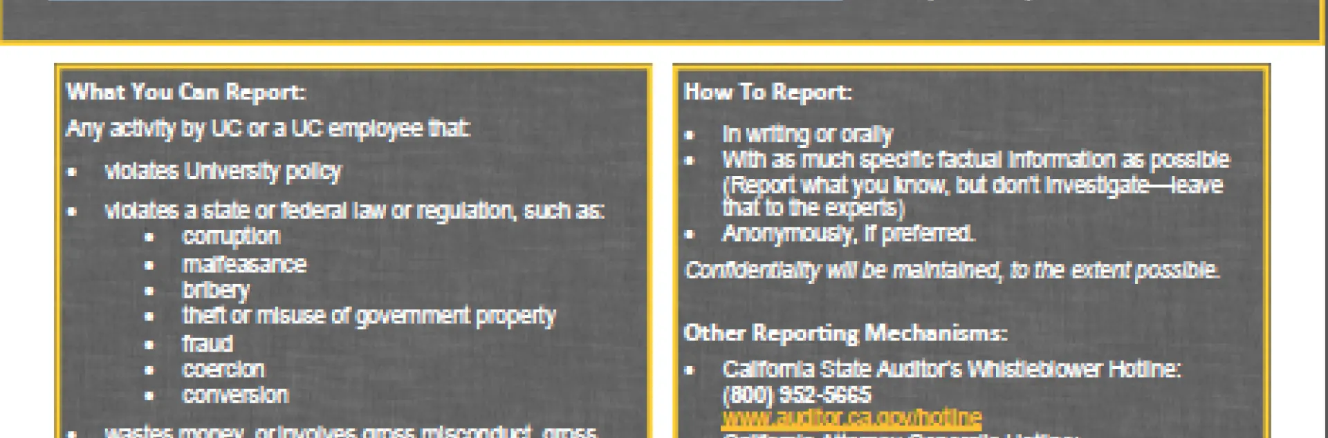 The University of California is committed to maintaining the highest standards of conduct in the fulfillment of its education, research, public service and patient care mission. The University's Whistleblower Policy provides multiple avenues for employees to bring forward concerns of potential employee misconduct. Faculty and staff are encouraged to bring forward concerns about possible improper governmental activity directly to their supervisor, department head, Locally Designated Official (LDO) or other appropriate university offices or officials.