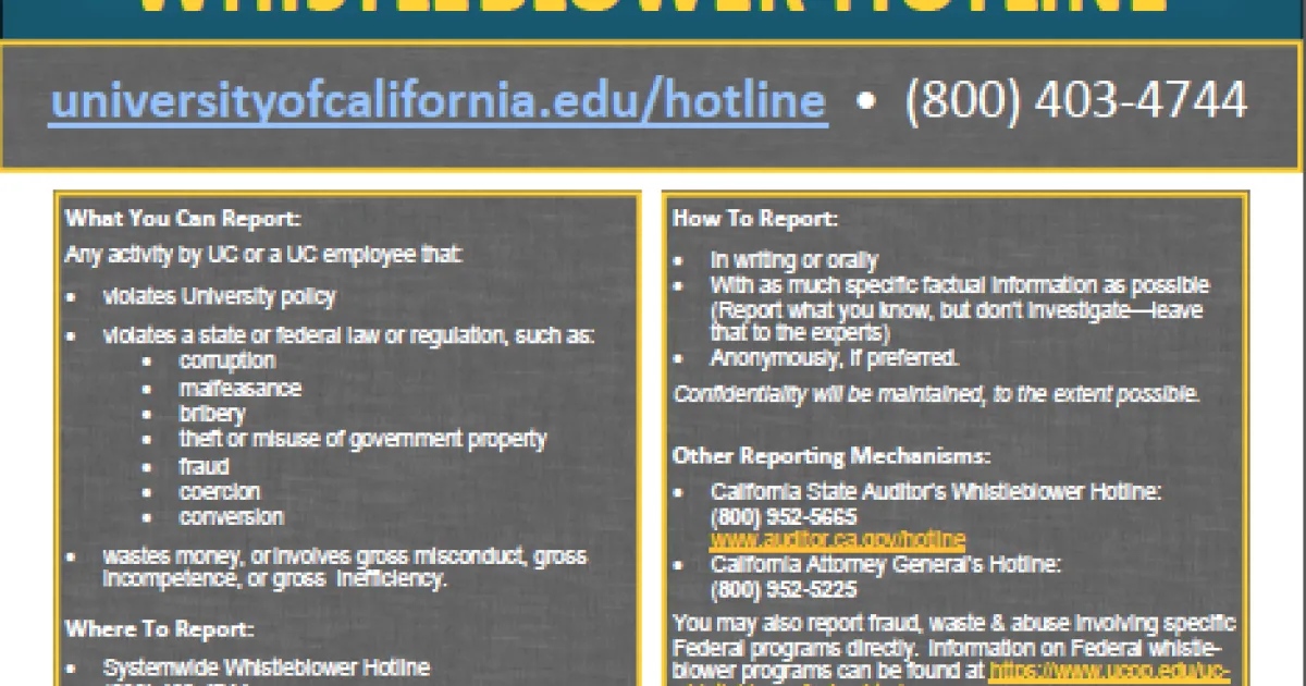 The toll-free number is 1-800-403-4744. Web-based reports can be made by accessing http://universityofcalifornia.edu/hotline. More information about the whistleblower process can be found on the UC Whistleblower website and on posters displayed in various employee areas.