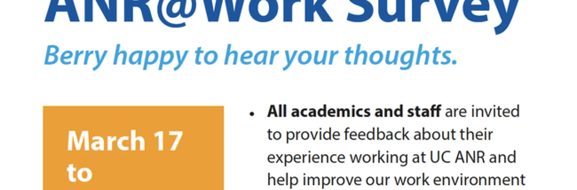 The ANR@Work Survey has the subject line “ANR@Work Survey - INVITATION - DO NOT DELETE.” The ANR@Work Survey will be open through April 3. It is an opportunity for all academics and staff to provide feedback about their experience working at UC ANR.