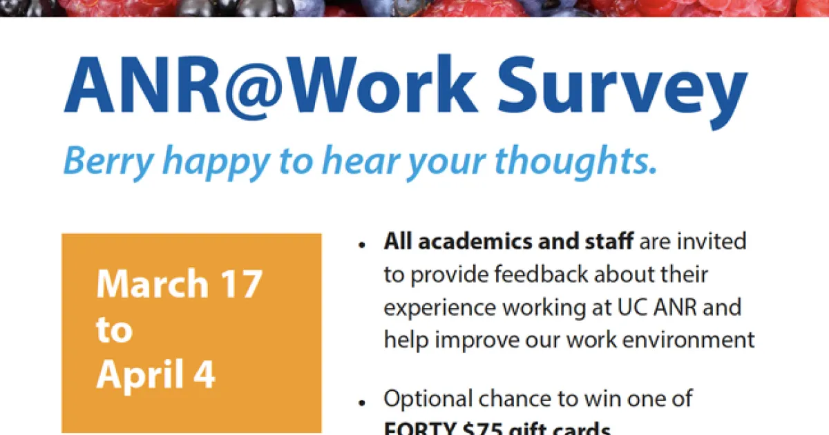 The UC ANR community is founded on principles strengthened by common goals, shared interests, camaraderie and a passion for improving the quality of life in all communities. We all have the right to work in an environment that promotes fairness, trust, respect, and physical and emotional safety and security. Your anonymous survey responses will contribute to our efforts to create the best possible work environment for all of us.
