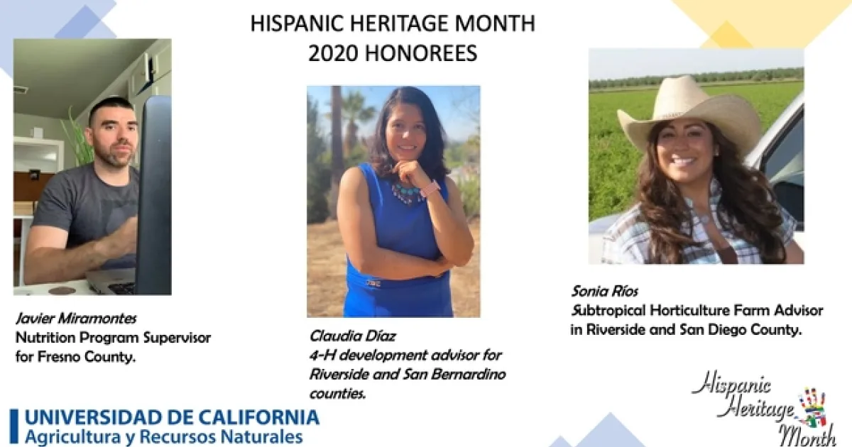 UC Agriculture and Natural Resources joins the Hispanic Heritage Month celebration by recognizing three Latino academics or educators who serve their communities while upholding UC ANR's values of academic excellence, honesty, integrity and community service.