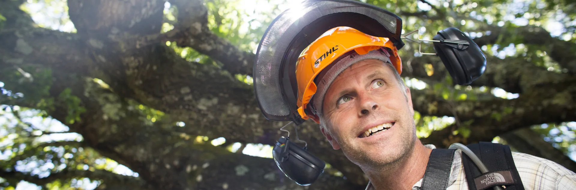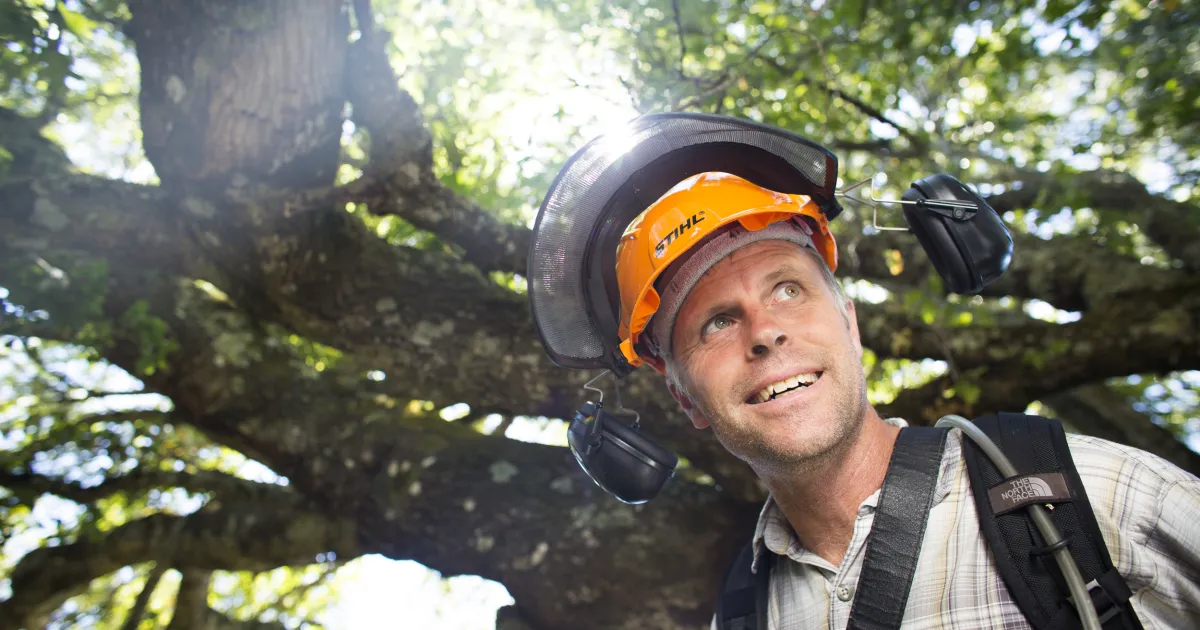 Steven, wearing an orange hard hat with black hearing protection, stands under a large oak tree