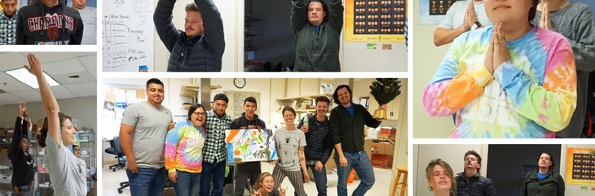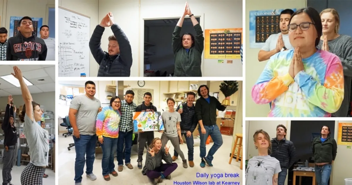 First runner-up in the contest was a photo collage of members of the Houston Wilson lab at the UC Kearney Agricultural Research and Extension Center. Staff research associate Jessia Maccaro (pictured in the lower left corner of the photo collage) leads staff in a daily yoga practice in the winter to get everyone in the right frame of mind for working together inside the lab.