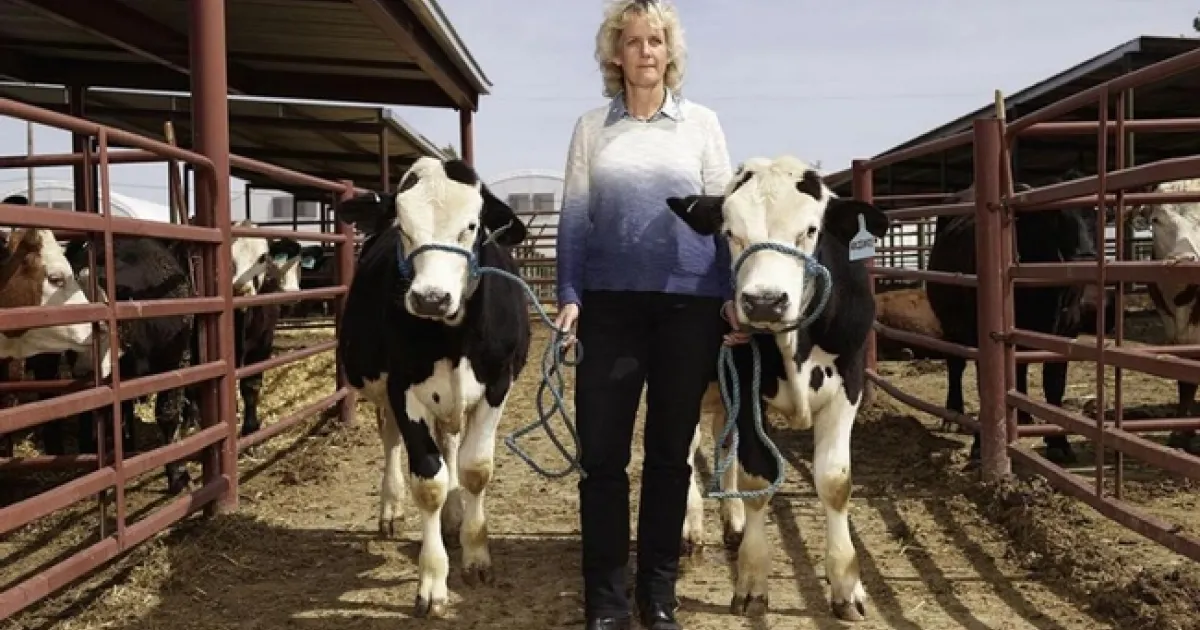 Alison Van Eenennaam with hornless cattle. (Photo: Aleksandra Domanovic and Spencer Lowell)