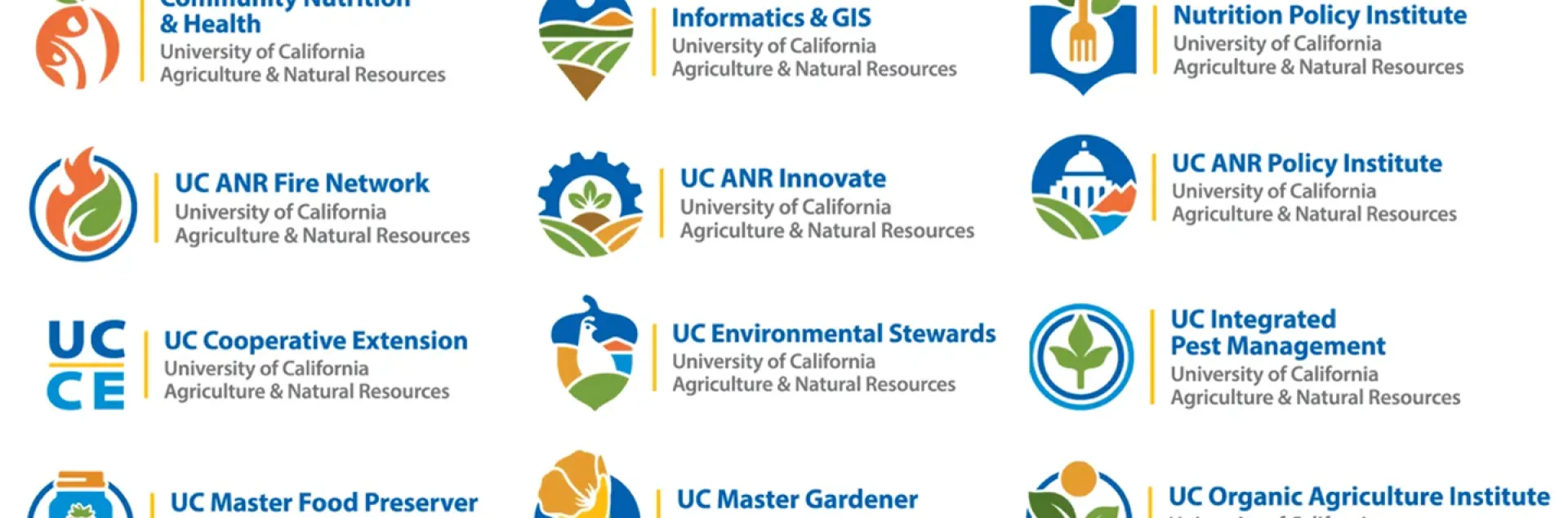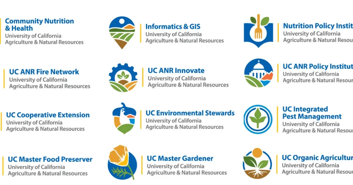 The new look is the result of months of collaborative work with organizational leaders and CMB Design Partners, who were hired in 2024 to address a 2022 brand audit recommendation to improve and align the sub-brand family. The portfolio also includes logos for several newer statewide programs: Community Nutrition and Health, UC ANR Fire Network, UC ANR Innovate, UC ANR Policy Institute, UC Environmental Stewards and UC Small Farms Network. There are 18 sub-brands in the UC ANR family.