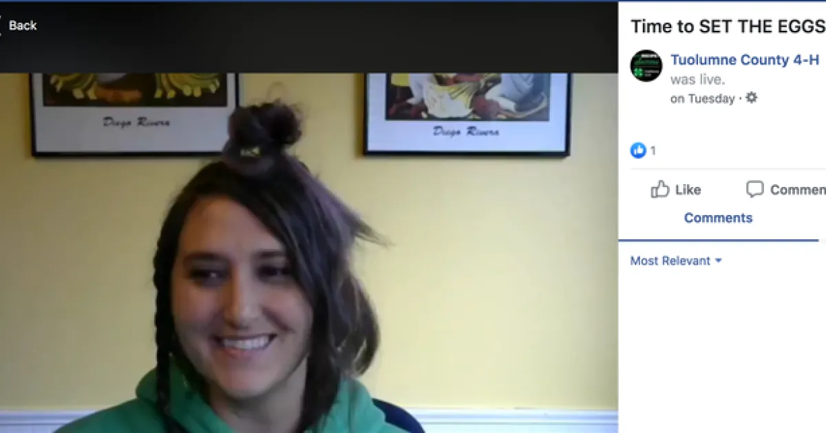 JoLynn Miller is livestreaming embryology lessons on FaceBook for 4-H youth in Amador, Calaveras, El Dorado and Tuolumne counties. Check out yesterday's lesson on chick hatching (featuring JoLynn's crazy hair for Spirit Week) at https://www.facebook.com/Tuolumnecounty4h/videos/235774560806010/.