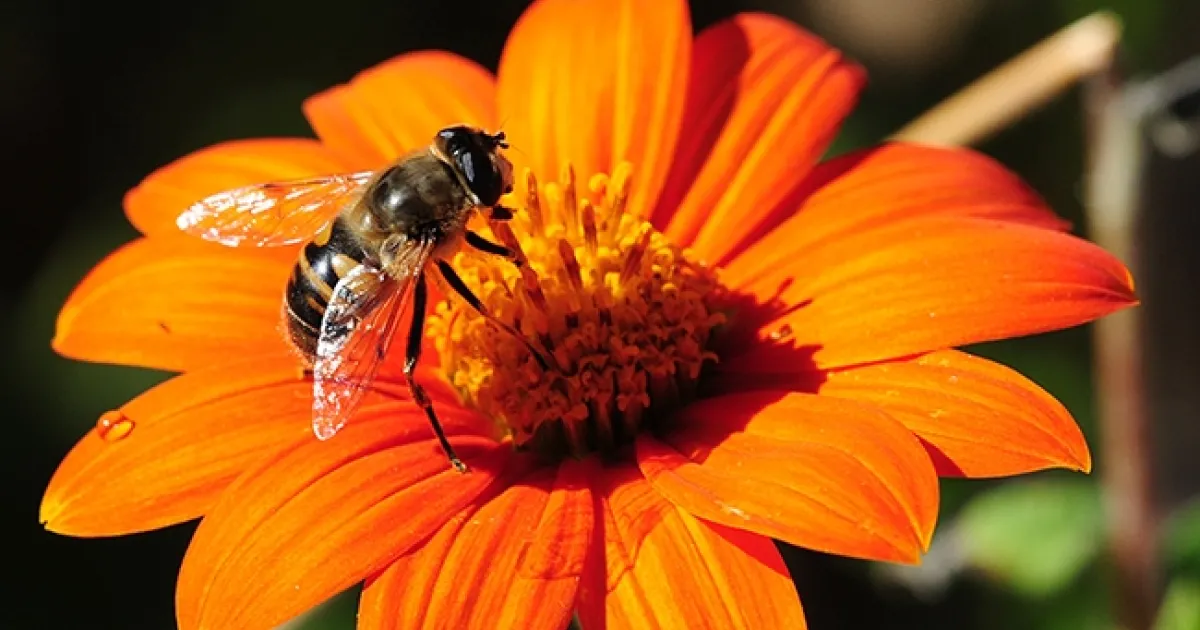 Like a worker honey bee, the adult drone fly is a pollinator and is often mistaken for a honey bee. Unlike a honey bee, however, it has one set of wings, large eyes, stubby antennae, and a distinguishing "H" on its abdomen.