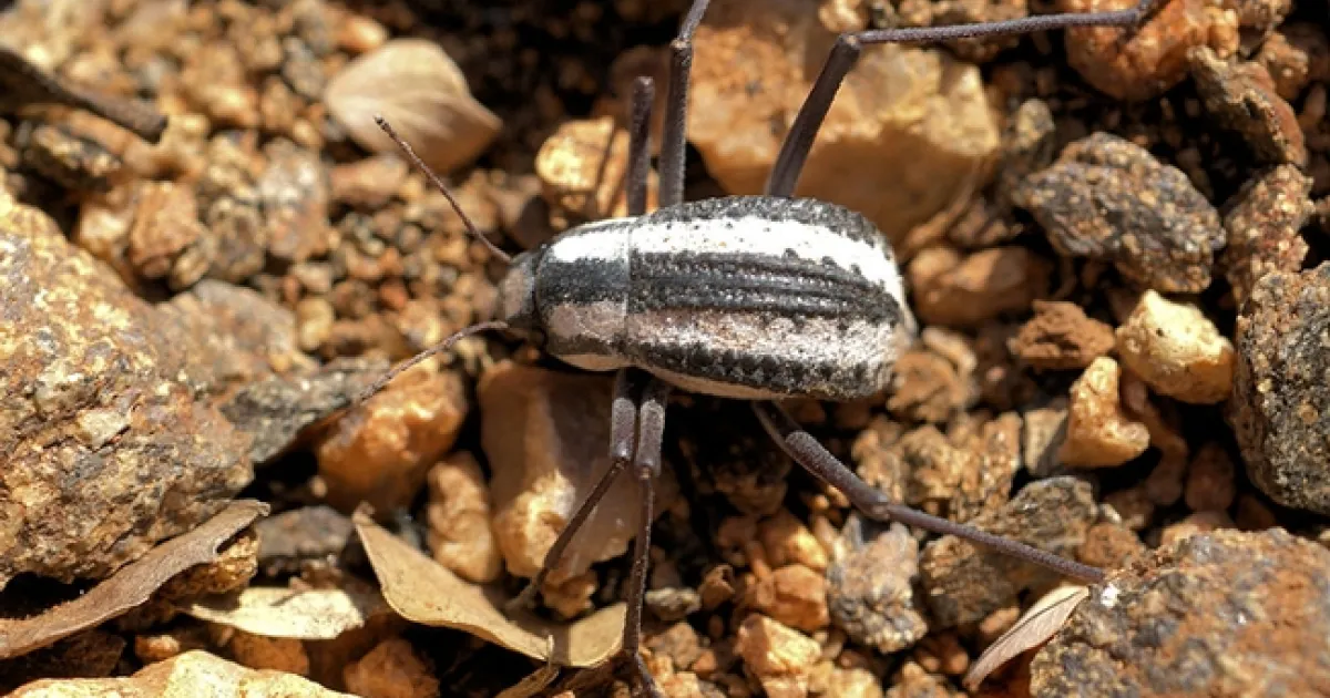 The Namibian Beetle (Stenocara gracilipes) lives in the Namib Desert, one of the driest deserts in the world. Located on the southwest coast of Africa, the desert receives only 0.55 of an inch of rain a year, according to Wikipedia. The beetle survives by harvesting the early morning fog, which is why it's called the fogstand beetle or "the fog-harvesting Namib Desert beetle."