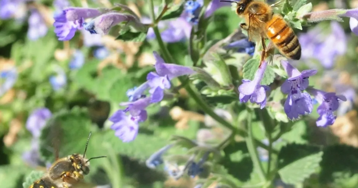 Male European carder bee (left) targets a honey bee on catmint. (Photo by Kathy Keatley Garvey)