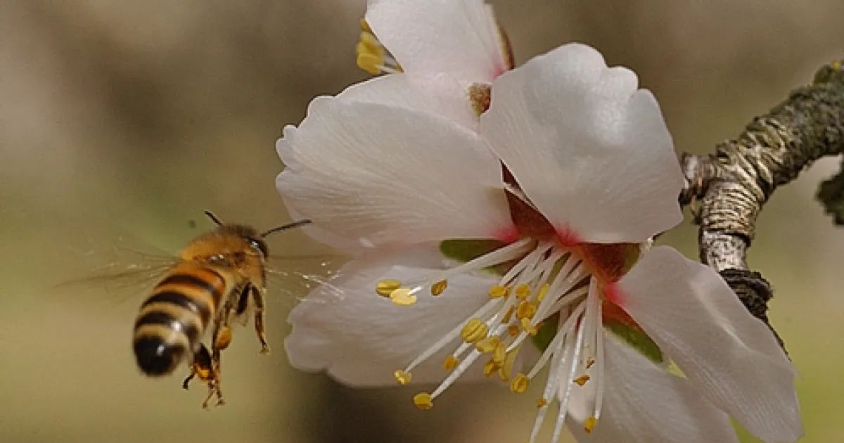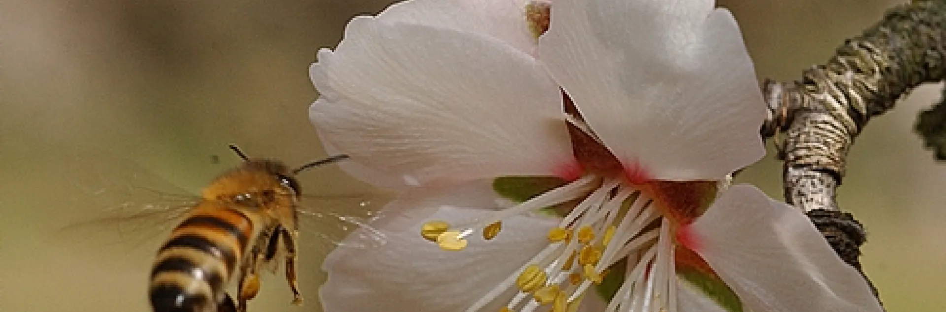HONEY BEE heads toward an almond blossom. Saturday, Aug. 22 is National Honey Bee Awareness Day. Without honey bees, we would not have almonds. Two hives per acre are needed to pollinate California's 700,000 acres. (Photo by Kathy Keatley Garvey)