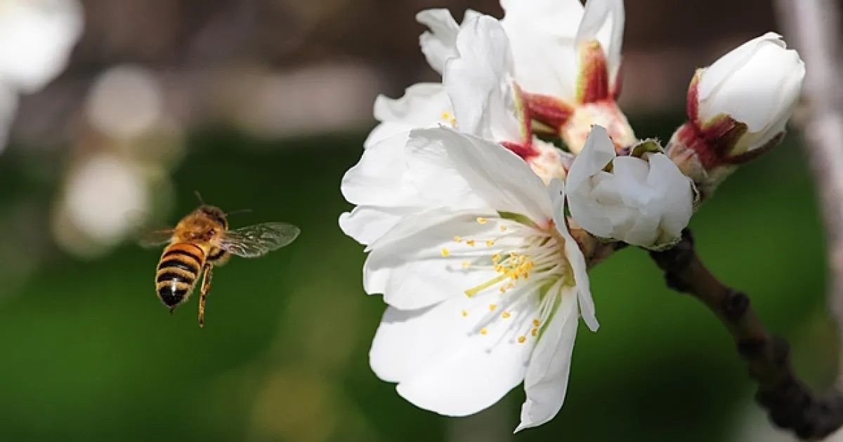 A honey bee heads for an almond blossom in Davis, Calif. (Photo by Kathy Keatley Garvey)