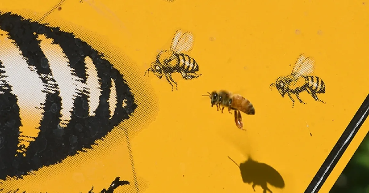 A "real" honey bee flying alongside "fake" bees on a bee crossing sign.