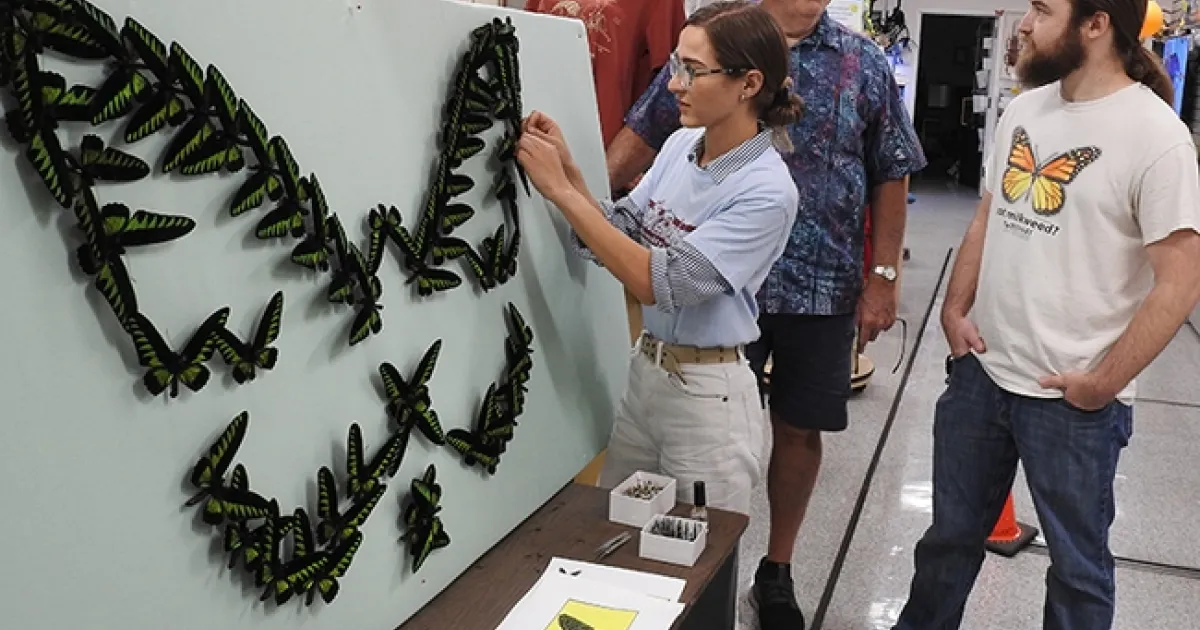 Bohart Museum laboratory assistant and artist Brittany Kohler worked on the "Birdwing Butterfly" display in late October. In back are Jeff Smith, curator of the Lepidoptera collection at the Bohart, who spread all the wings; and collections manager Brennen Dyer. (Photo by Kathy Keatley Garvey)