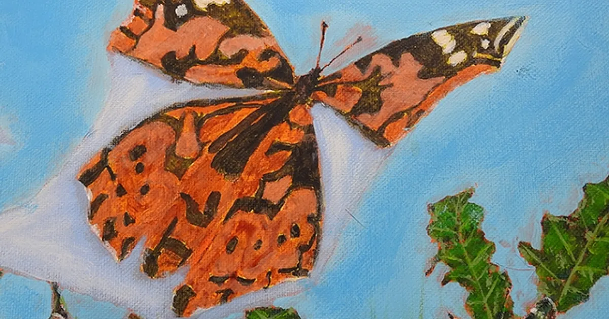 Valdez' painting depicts 13 painted ladies fluttering by him or stopping to nectar. That's something you don't see often except during the height of a migration.