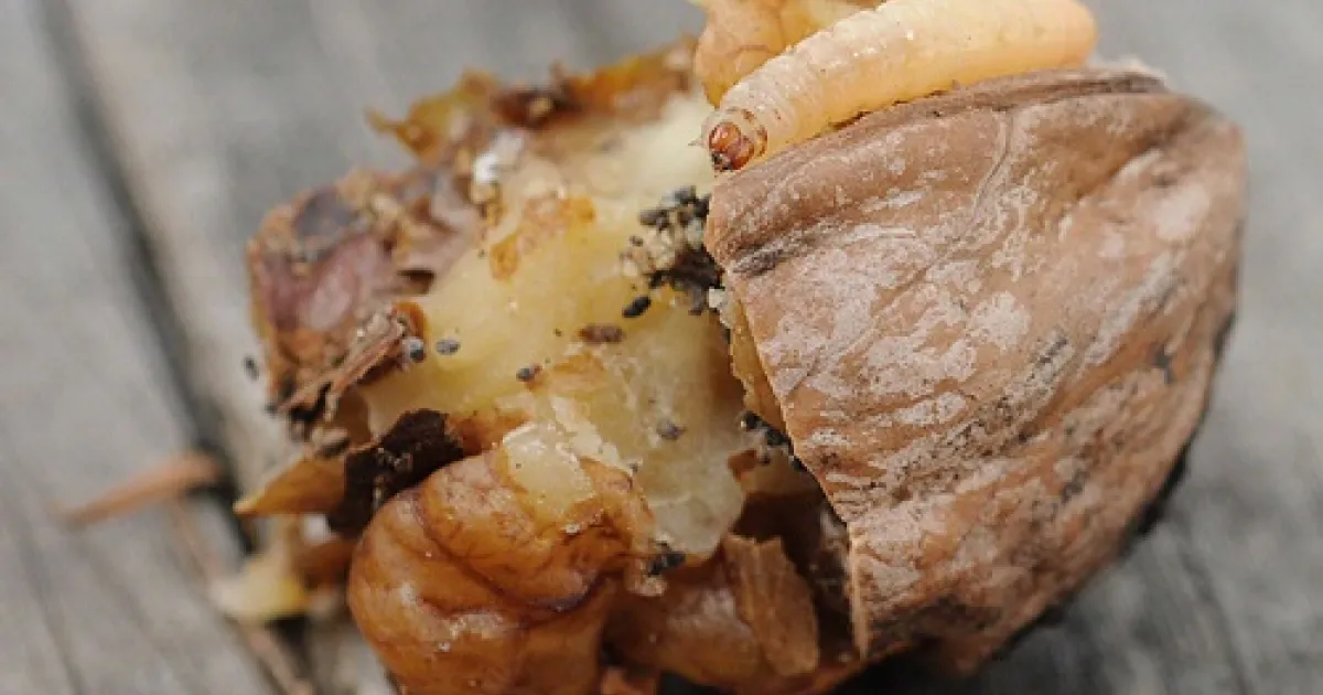 Sometimes you'll find two or three navel orangeworm (NOW) larvae inside a single walnut, along with copious amounts of webbing and frass.