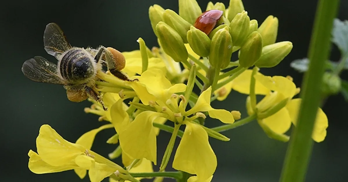 Honey Bee: "Hi, ladybug. Let's share the mustard, okay? You take the aphids--I don't eat aphids--and I'll take the nectar and pollen.  Is that all right with you?"