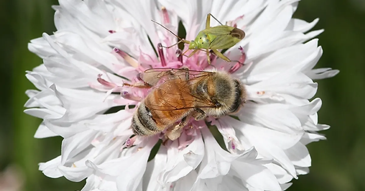 The bee finally buzzed off, leaving the lygus bug to "dine" alone.