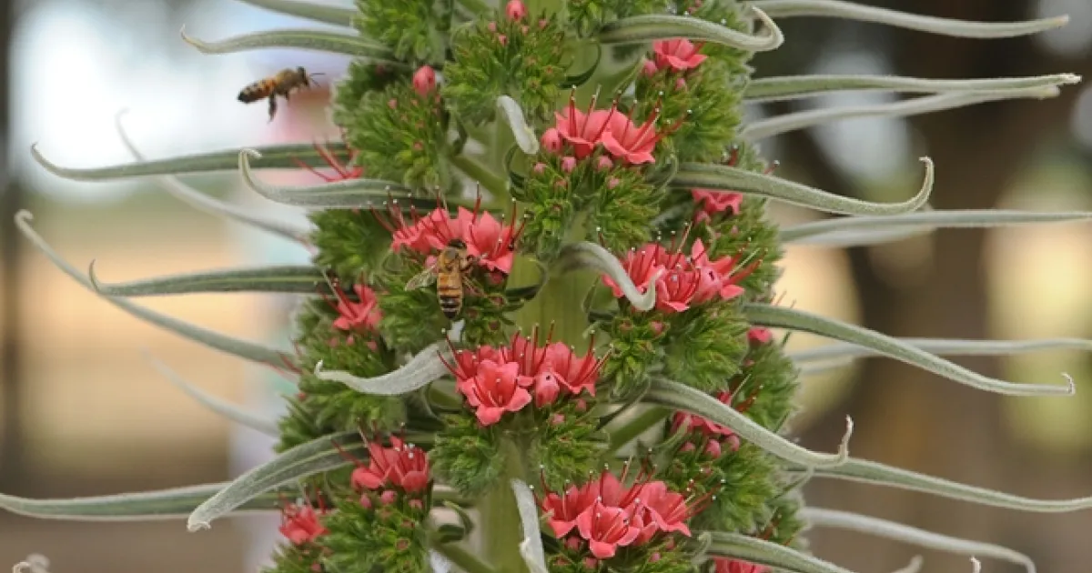 Honey bee heads for the tower of jewels (Echium wildpretii). There are two bees in this photo. (Photo by Kathy Keatley Garvey)