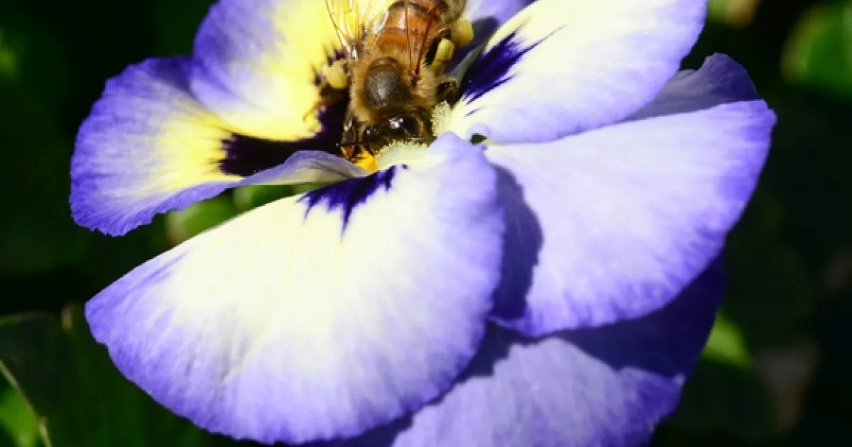 Honey bee foraging on a pansy. (Photo by Kathy Keatley Garvey)