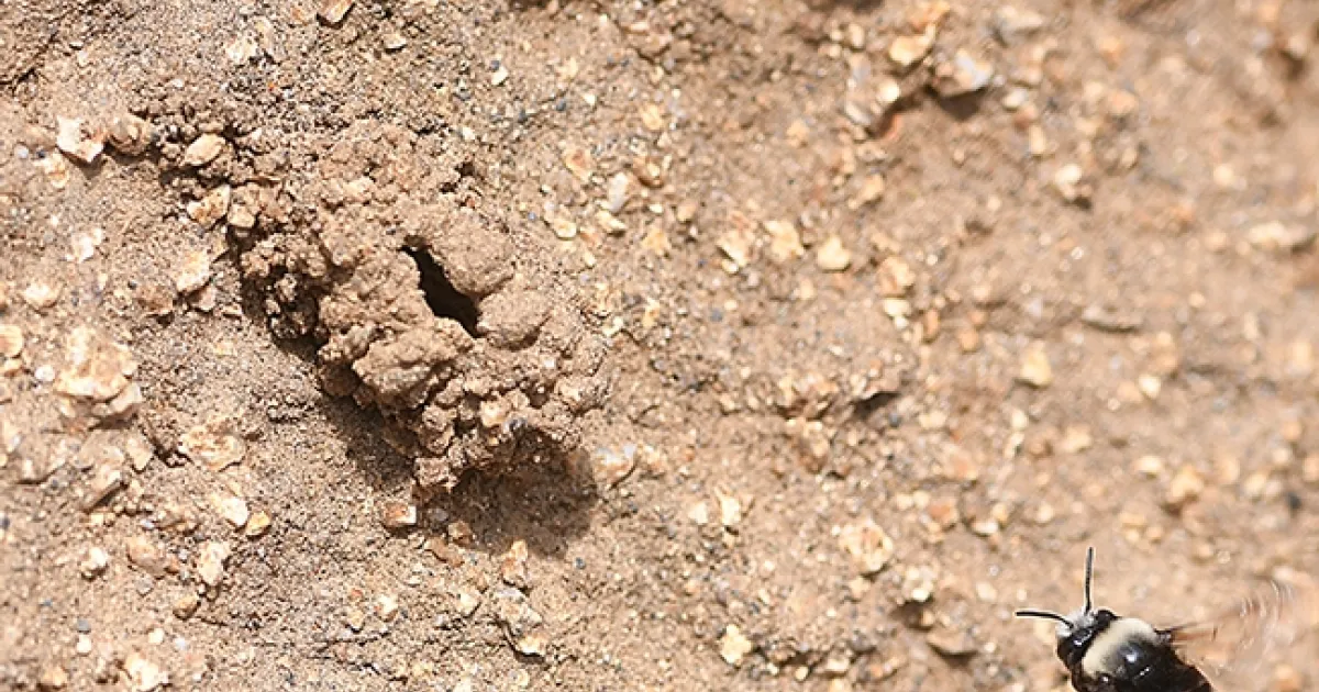 "The species name indicates that it is a bumble bee mimic," the late Robbin Thorp, a global authority on bumble bees and a UC Davis distinguished emeritus professor of entomology, told us several years ago. "These bees need a source of fresh water nearby.  Females suck up water, regurgitate it on the sandstone bank surface, then dig away at the soft mud.  They use some of the mud to build entrance turrets, presumably to help them locate their nests within the aggregation of nests."