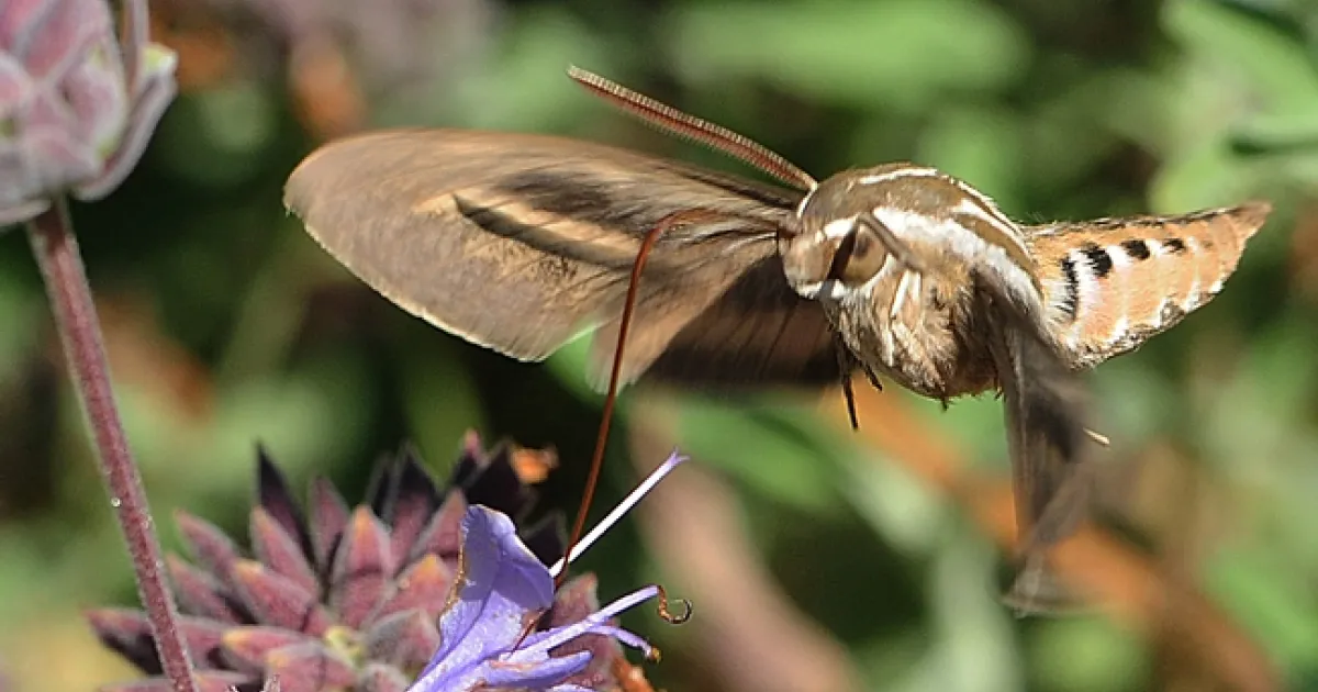 With a wing span between 2.7 and 3.9 inches long, it's easy to notice as it nectars on salvia (sage), honeysuckle, larkspur, columbines and other flowers. Some folks know it by its nickname, "the hummingbird moth."