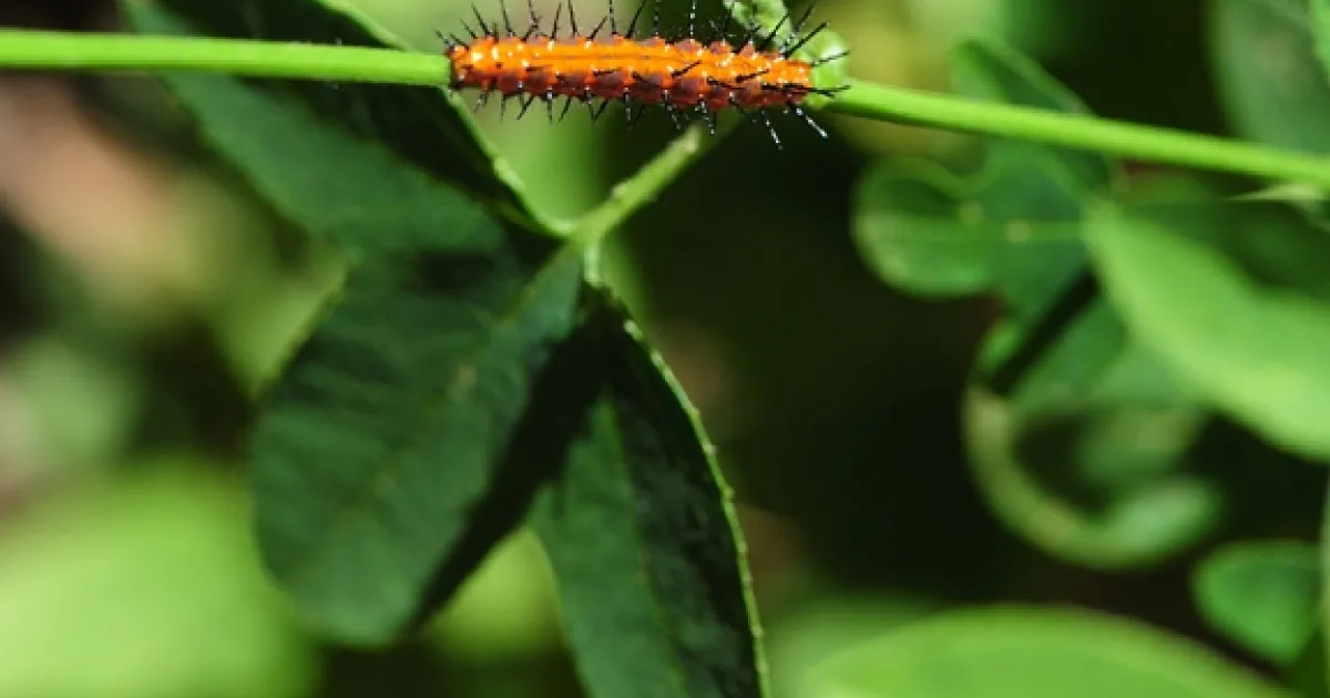 If they're allowed to, these caterpillars will decimate the leaves, spin cocoons and eventually turn into spectacular reddish-orange butterflies (Agraulis vanillae).