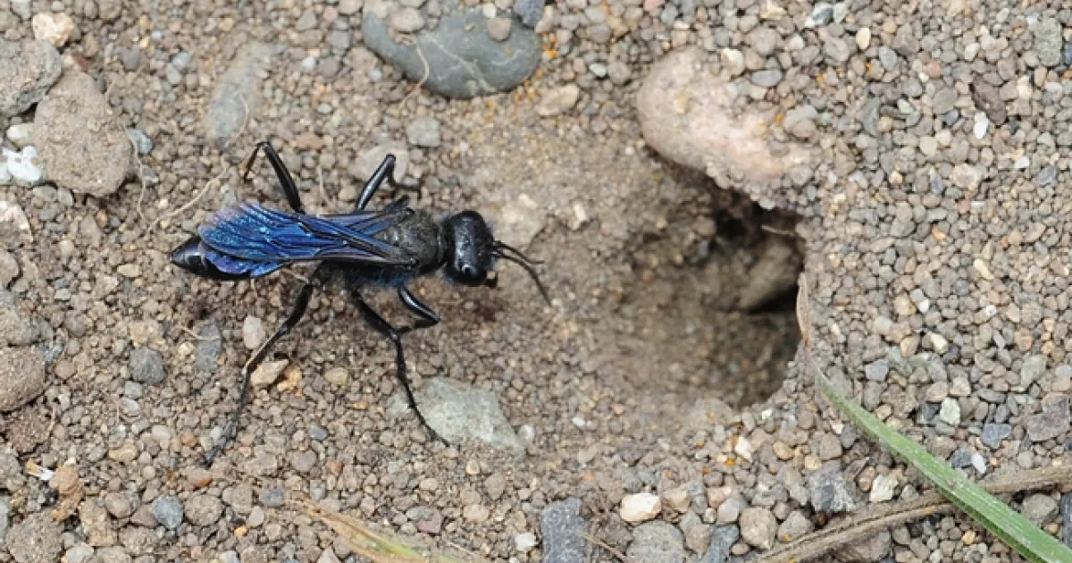 And if they're lucky--a metallic blue digger wasp from the Sphecidae family of thread-waisted wasps.