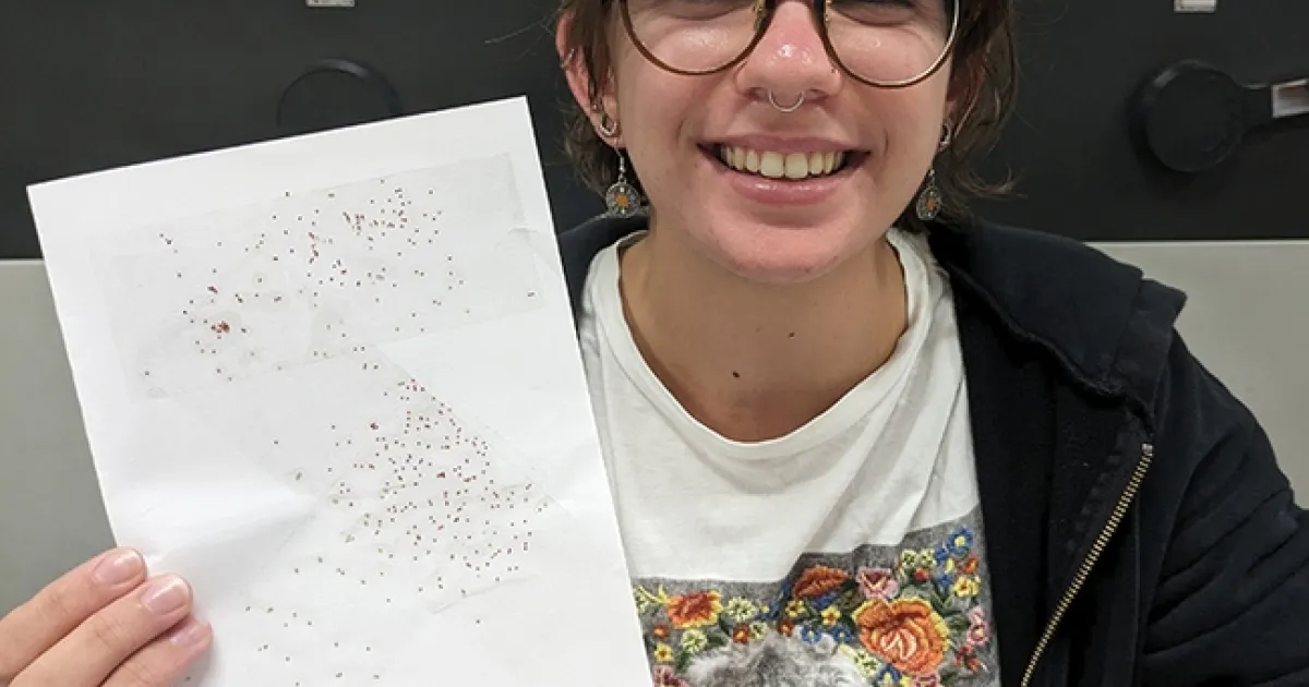 Hanna Briggs, a UC Davis transfer student, holds a sample card showing how glitter mimics insects. She is an intern in the laboratory of arachnologist Jason Bond, the Schlinger Endowed Chair, UC Davis Department of Entomology and Nematology, and associate dean, College of Agricultural and Environmental Sciences.