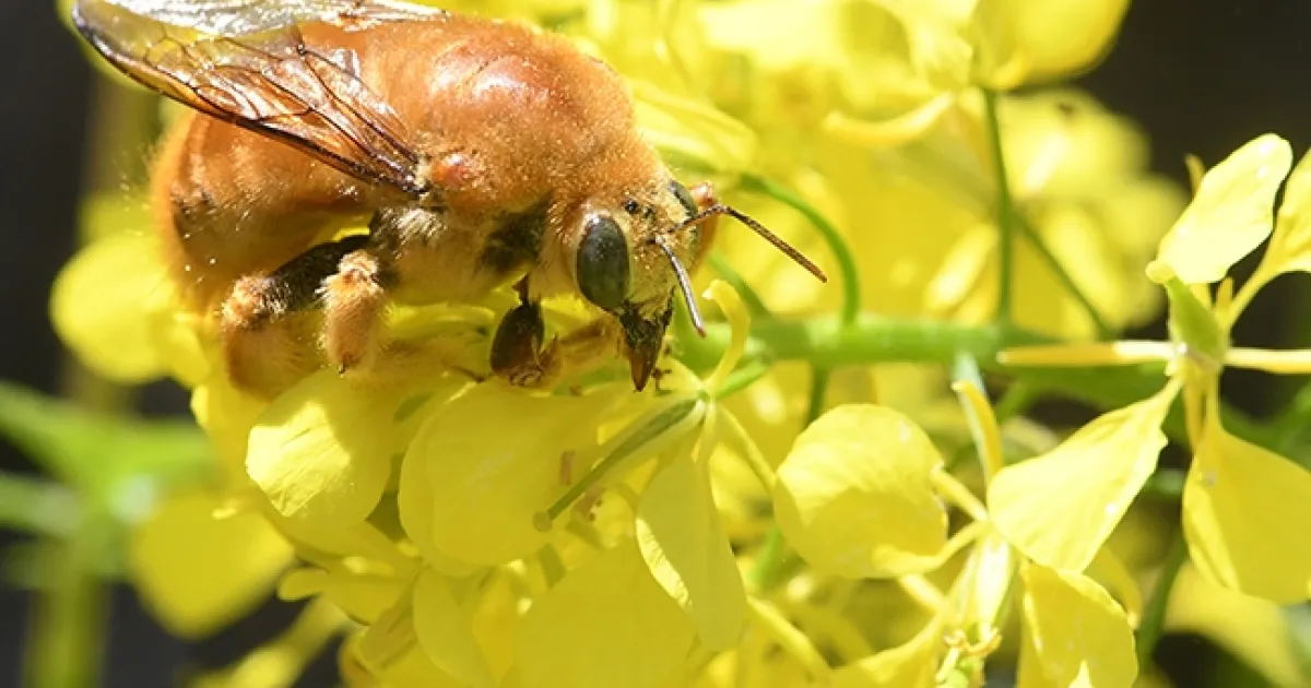 We have lift-off! The teddy bear bee, Xylocopa varipuncta,leaves a mustard blossom. (Photo by Kathy Keatley Garvey)