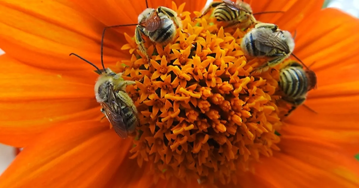 Over the last two weeks, we've been monitoring the number of males sleeping on a single Mexican sunflower, Tithonia rotundifola, in our Vacaville pollinator garden. On the first night, two. Then three, then four. The slumber party grew to five last night. They sleep on a 10-foot-high blossom (talk about height advantage and a bird's eye view)! Every night, they return to the very same blossom.