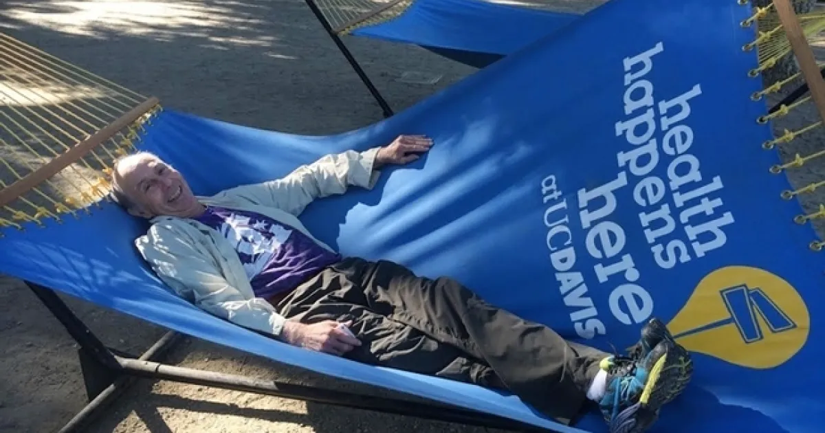 UC Davis distinguished professor Bruce Hammock "rests" in a hammock on the UC Davis campus. The occasion: the Hammock lab scientists were walking across campus (before the coronoavirus pandemic precautions). (Photo by Cindy McReynolds)