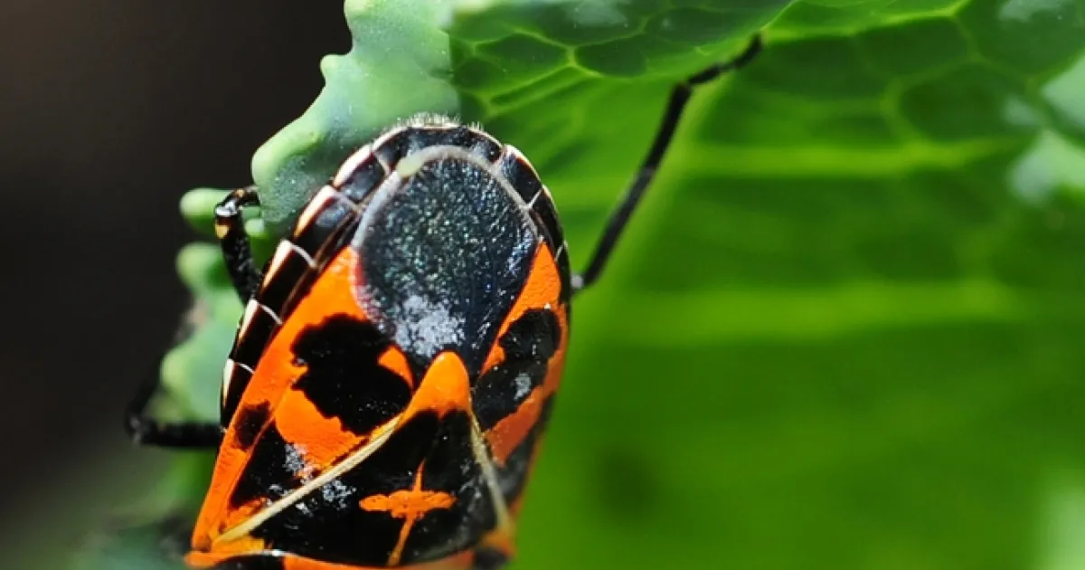 Harlequin cabbage bug crawling on cabbage leaf. (Photo by Kathy Keatley Garvey)