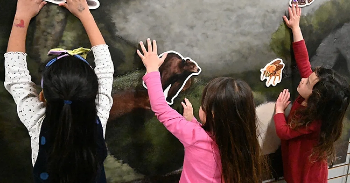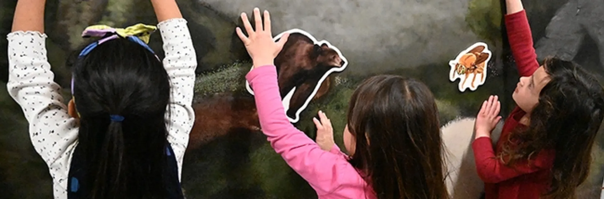 Three youngsters delight in moving wildlife around--a squirrel, a bear, a carpenter bee and a butterfly--at the Bohart Museum of Entomology during the 12th annual UC Davis Biodiversity Museum Day. (Photo by Kathy Keatley Garvey)