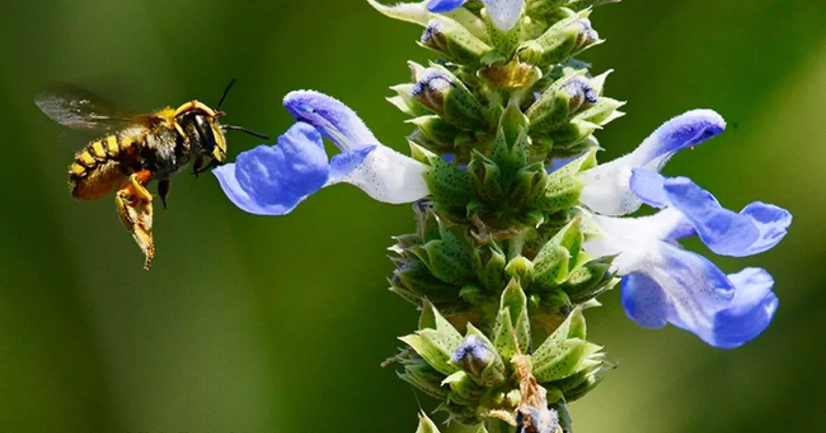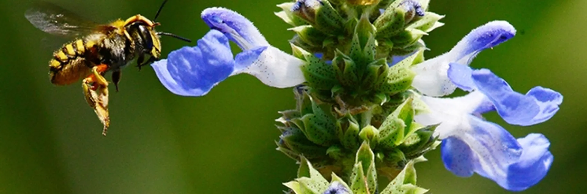 European wool carder bee, Anthidium manicatum, heads toward a blue spike sage, Salvia uliginosa. (Photo by Kathy Keatley Garvey)