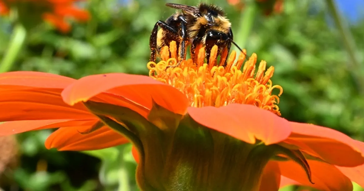 A perfect match: a bumble bee foraging on a Mexican sunflower, Tithonia rotundifola.