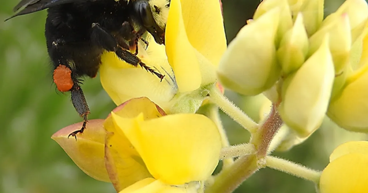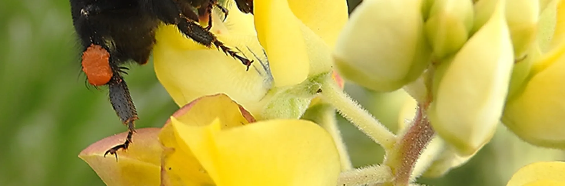 A queen yellow-faced bumble bee, Bombus vosnesenskii, foraging on yellow bush lupine at Doran Regional Park, Bodega Bay. Note the bright red pollen. (Photo by Kathy Keatley Garvey)
