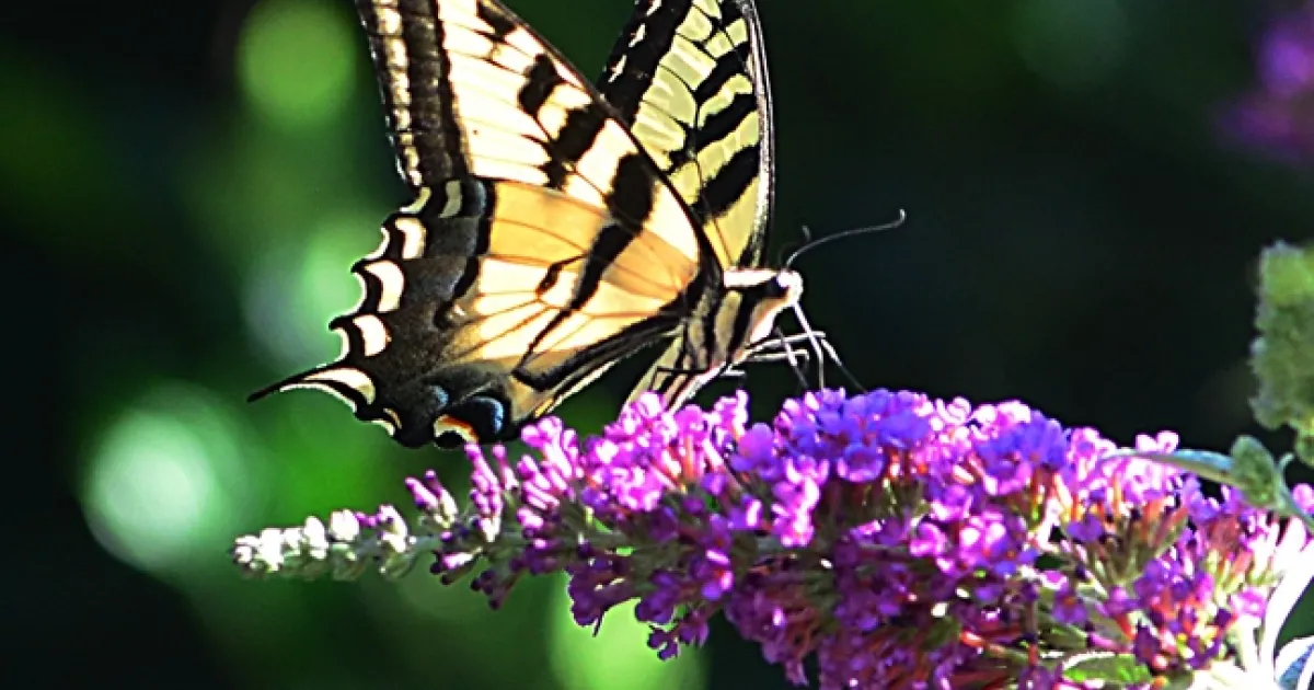 A Western tiger swallowtail nectarine on a butterfly bush. (Photo by Kathy Keatley Garvey)