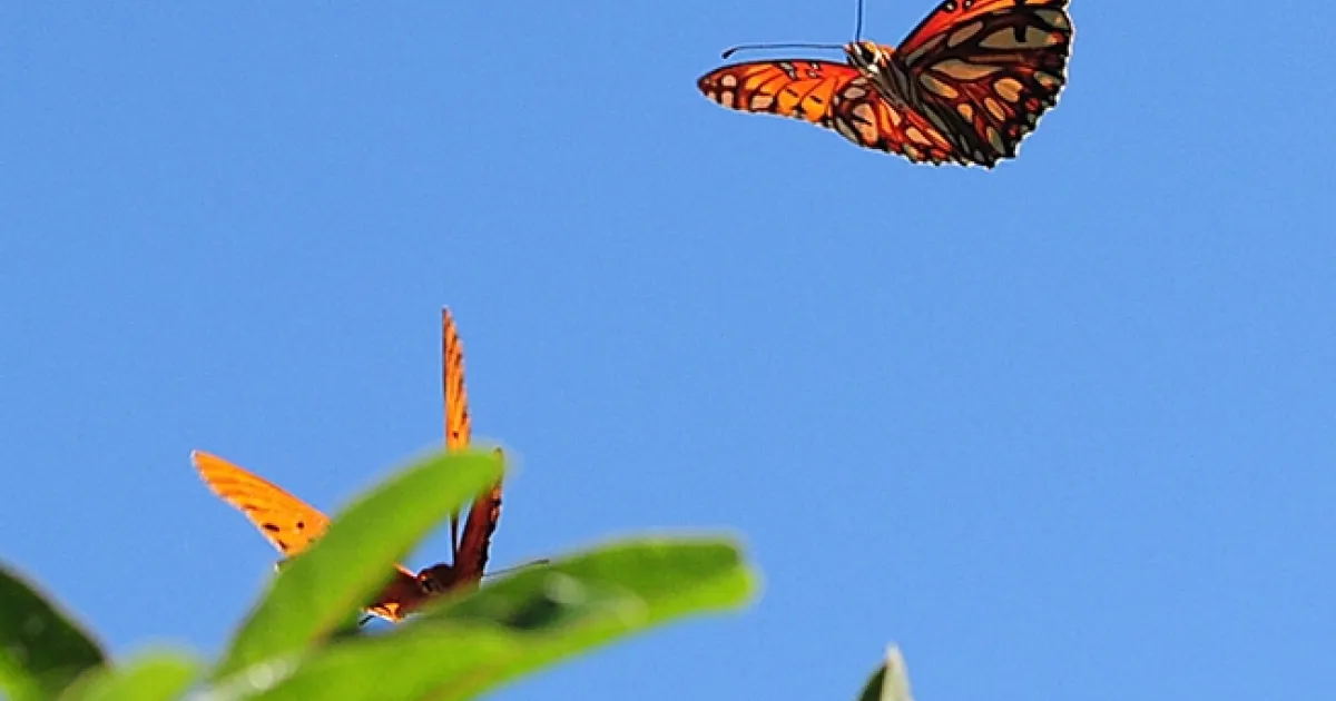 The Gulf Fritillaries (Agraulis vanillae), orangish-reddish butterflies with silver-spangled wings, stay close to Passiflora, their host plant. It's the circle of life. The males patrol for females, find them, and mate. The females lay eggs, eggs become caterpillars, caterpillars become chrysalids. The adults emerge, and the Butterfly Ballet begins anew.