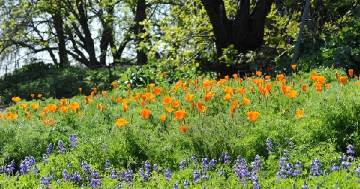 The Campus Buzzway, a quarter-acre field of wildflowers planted last fall near the Harry H. Laidlaw Jr. Honey Bee Research Facility at the University of California, Davis, is brilliant in gold and blue, the UC Davis colors.