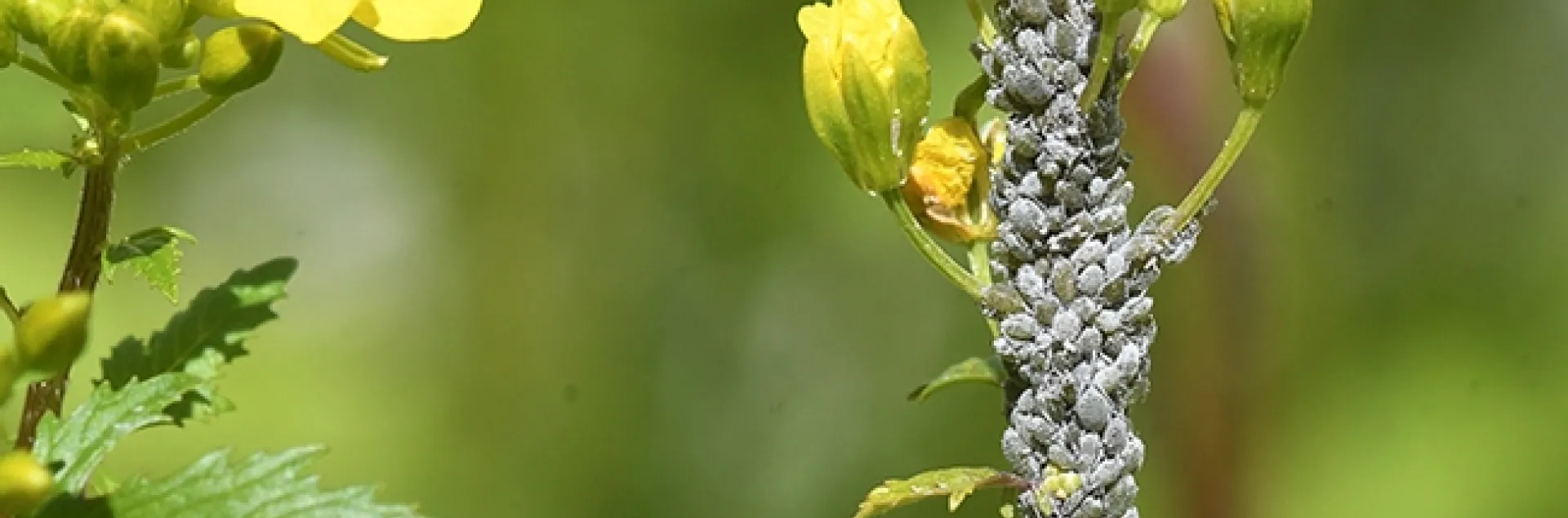 Close-up of cabbage aphids, Brevicoryne brassicae, on yellow mustard. (Photo by Kathy Keatley Garvey)