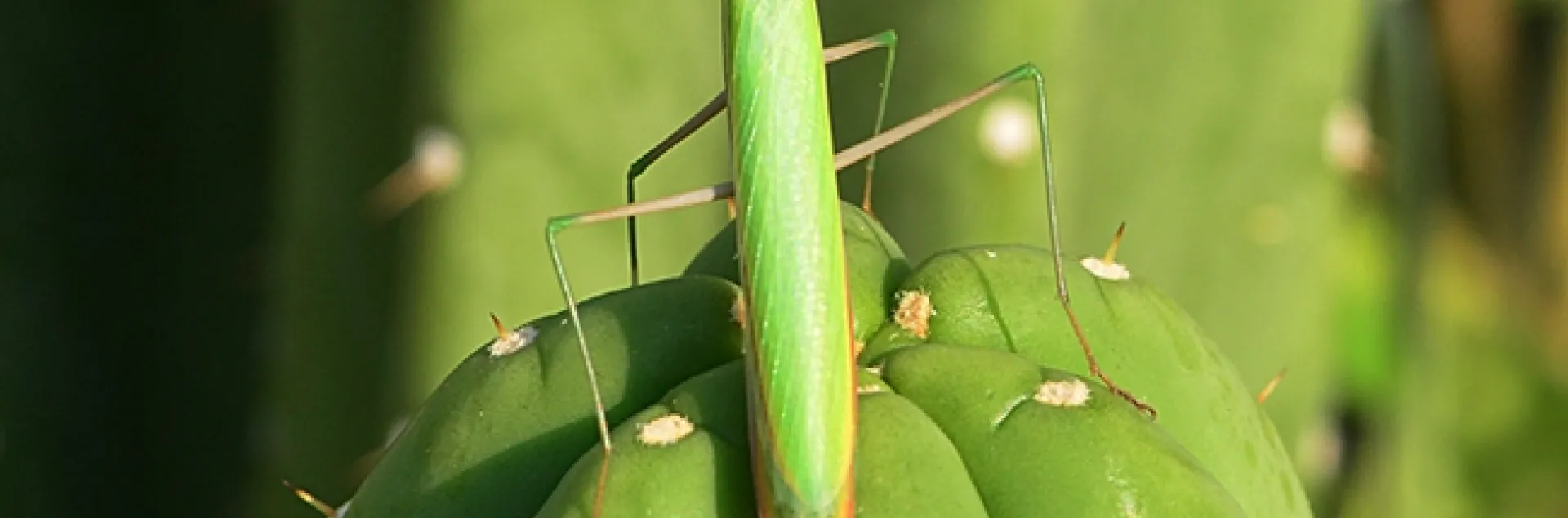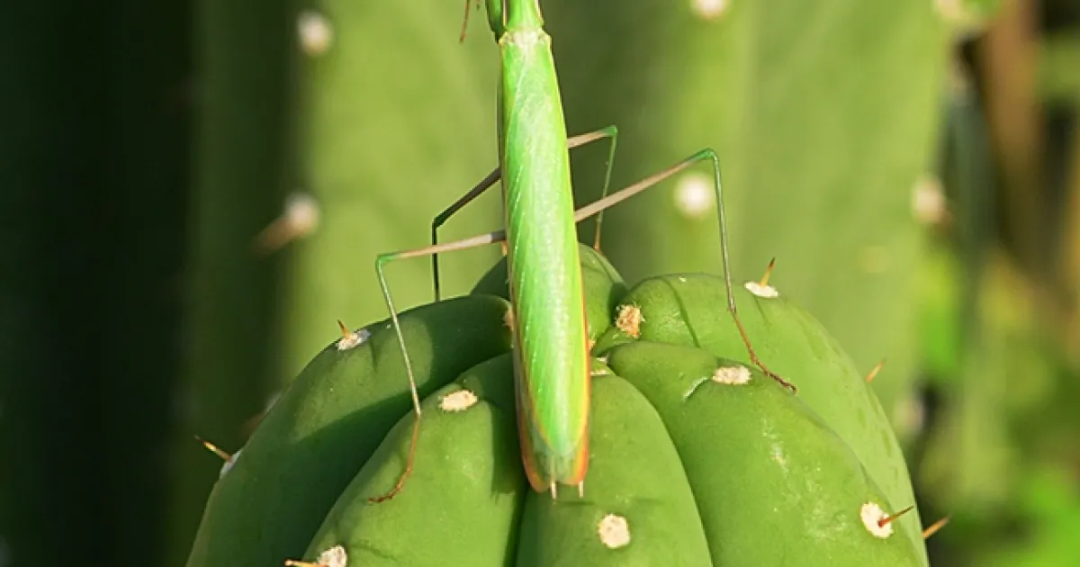 It's a sight you don't see very often. First, because praying mantids usually blend into their environment. Second, how many times have you seen a green praying mantis climb a green cactus? And third, this cactus climber has something in common with the plant: the needlelike "ouch" factor. The cactus is spiny. The praying mantis has spiked forelegs to grasp its prey.