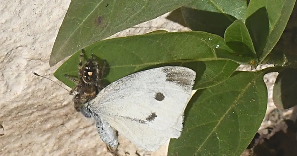 Herman the jumping spider nails a cabbage white butterfly. (Photo by Kathy Keatley Garvey)