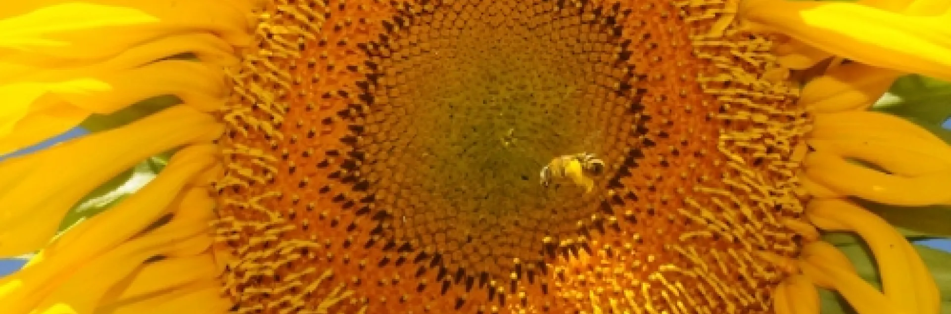 She's a pollen-packed sunflower bee enjoying our sunflower. Not a honey bee but a sunflower bee. A native bee.